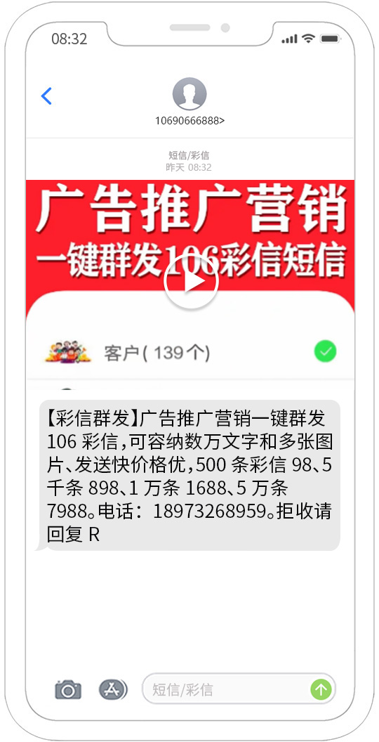 2、視頻短信三網覆蓋,5秒必達,手機適配度可達99.99%,2MB大小內容相當于30秒高清視頻,5張高清圖片或者幾十萬文字小說。信息保存于短信收件箱內,可隨時反復查看,增強營銷效果。